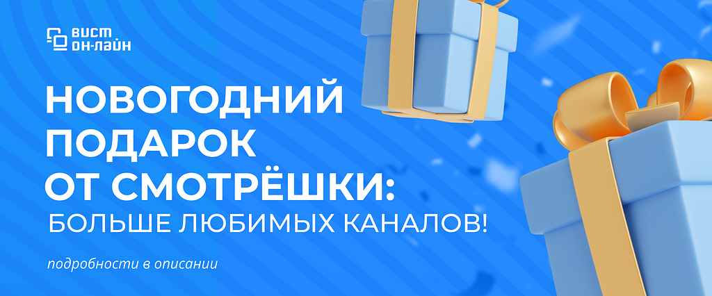 Для наших абонентов с подключенной услугой телевидения с 25 декабря по 11 января — расширенный пакет телеканалов БЕСПЛАТНО! Больше фильмов, сериалов, шоу и праздничных программ — всё, что нужно для ярких новогодних каникул!